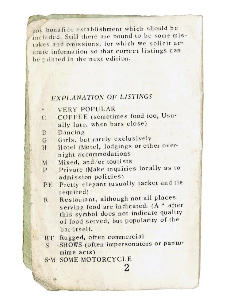 Damron’s books have immense value in the 21st century. Many of the bars, bath houses, and cruising locations within the guides no longer exist and because these establishments were illicit, official records were not kept. Additionally, because of the AIDS crisis, a large swath of the people who would remember this era of Queer history have been eternally silenced and are inaccessible for interviews. All of these conditions cause Queer history to appear invisible — something which is weaponized by those seeking to portray Queerness as a new-age fad indicative of moral decline. Damron’s books contradict this notion and, thanks to researchers Eric Gonzaba and Amanda Regan’s website Mapping the Gay Guides, their contents are now more accessible than ever.